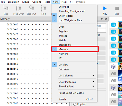 Next, in the menu bar go to View and check Memory. You'll see a window that looks like this. (Note that Dolphin only displays values in memory when emulation is paused, but values can still be set while emulation is running.) Pay attention to the highlighted section in the upper right, this is where we will be working.
