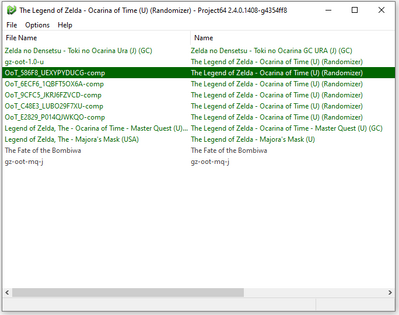 By default Project64 v2.4+ will display every Ocarina of Time ROM that's not a clean vanilla version as a randomizer seed. This can lead to confusion if your folder contains multiple OoTR seeds or rom hacks (see image below). It is recommended to display the File Name instead of the Name. To do this, open the Settings menu and go to ROM Selection. In the left column find and select File Name and then press Add ->. Then, if you wish for this information to be displayed first, select it in the right column and repeatedly press Up until it's at the top of the right column. If desired the Name entry can be removed by moving it to the left column with the <- Remove button. Click Apply.