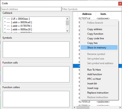 To enable the debugger, go to Config ⇒ Interface and check Show Debugging UI. A code window will pop up, and several things will be added to your toolbar. You can close the code window and ignore all the additions. Click on any of the addresses and select Show in memory.