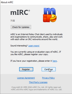 2.1 - Open up mIRC. mIRC will ask you to please Register; if you do not wish to register, click Continue, wait briefly, and then Continue will become a selectable option to click a second time. (You need to click Continue twice, with a bit of a delay in between – mIRC would really like you to register, please and thank you, and will make you wait a bit if you don't want to register.) | 2.1 - Open up mIRC. mIRC will ask you to please Register; if you do not wish to register, click Continue, wait briefly, and then Continue will become a selectable option to click a second time. (You need to click Continue twice, with a bit of a delay in between – mIRC would really like you to register, please and thank you, and will make you wait a bit if you don't want to register.) | ||