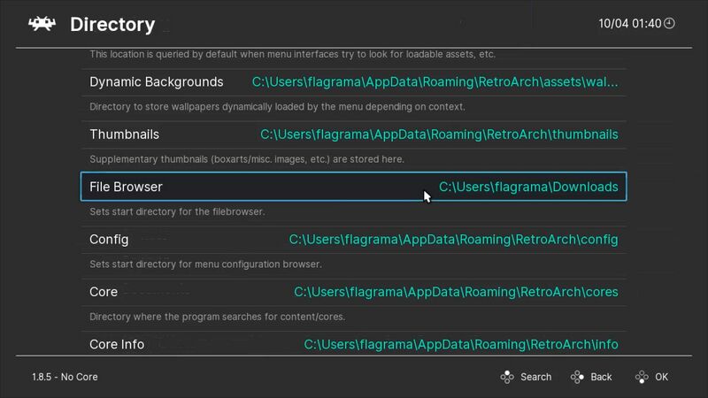 | current | 07:54, 10 April 2020 | 1,280 × 720 (159 KB) | Flagrama (talk | contribs) | RetroArch's Settings > Directory > File Browser option with a value similar to what most users will want to choose. |