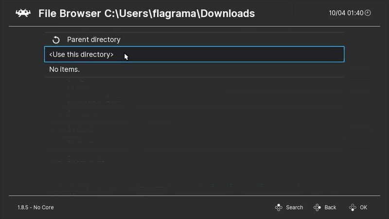 current07:53, 10 April 2020Thumbnail for version as of 07:53, 10 April 20201,280 × 720 (76 KB)Flagrama (talk | contribs)The Use this directory option highlighted in the RetroArch Settings > Directory > File Browser option.