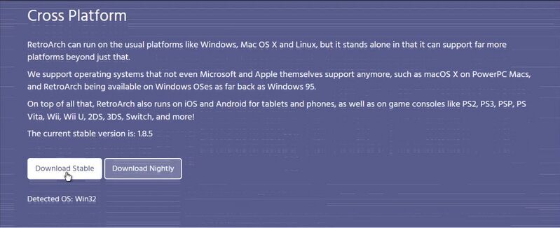 current07:34, 10 April 2020Thumbnail for version as of 07:34, 10 April 20201,262 × 515 (120 KB)Flagrama (talk | contribs)The Download Stable button on the RetroArch website.