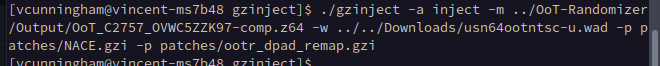 Open a terminal window, drag gzinject.exe into the window, then type a space followed by -a inject -m followed by a space, drag your randomizer ROM into the window, type another space and -w followed by another space. Drag the WAD into the window now. Lastly, type another space then -p patches/NACE.gzi -p patches/ootr_dpad_remap.gzi and press Enter. Note that if you are using the Japanese WAD you need to use NACJ.gzi instead of NACE.gzi. An example of the full line is ./gzinject -a inject -m ROM-comp.z64 -w OoT.wad -p patches/NACE.gzi -p patches/ootr_dpad_remap.gzi as well as an image below. Your WAD should be in the same location as your donor WAD but have the word -inject in it. That is the file you install on your Wii or run in Dolphin.
